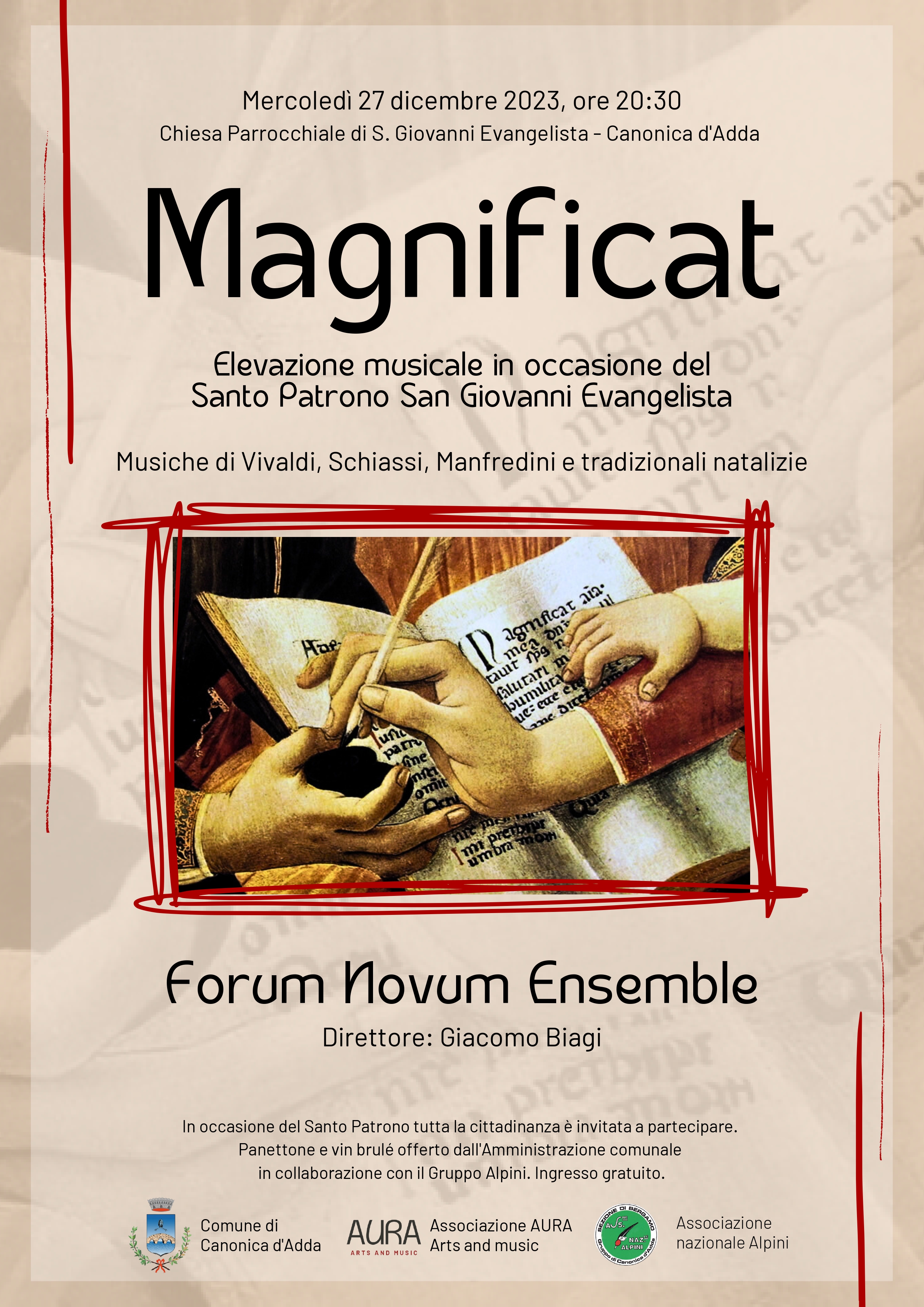 E per concludere la serata in letizia, vi aspettiamo al termine del concerto per un brindisi con panettone e vin brulè, organizzato in collaborazione con il Gruppo Alpini di Canonica d’Adda!