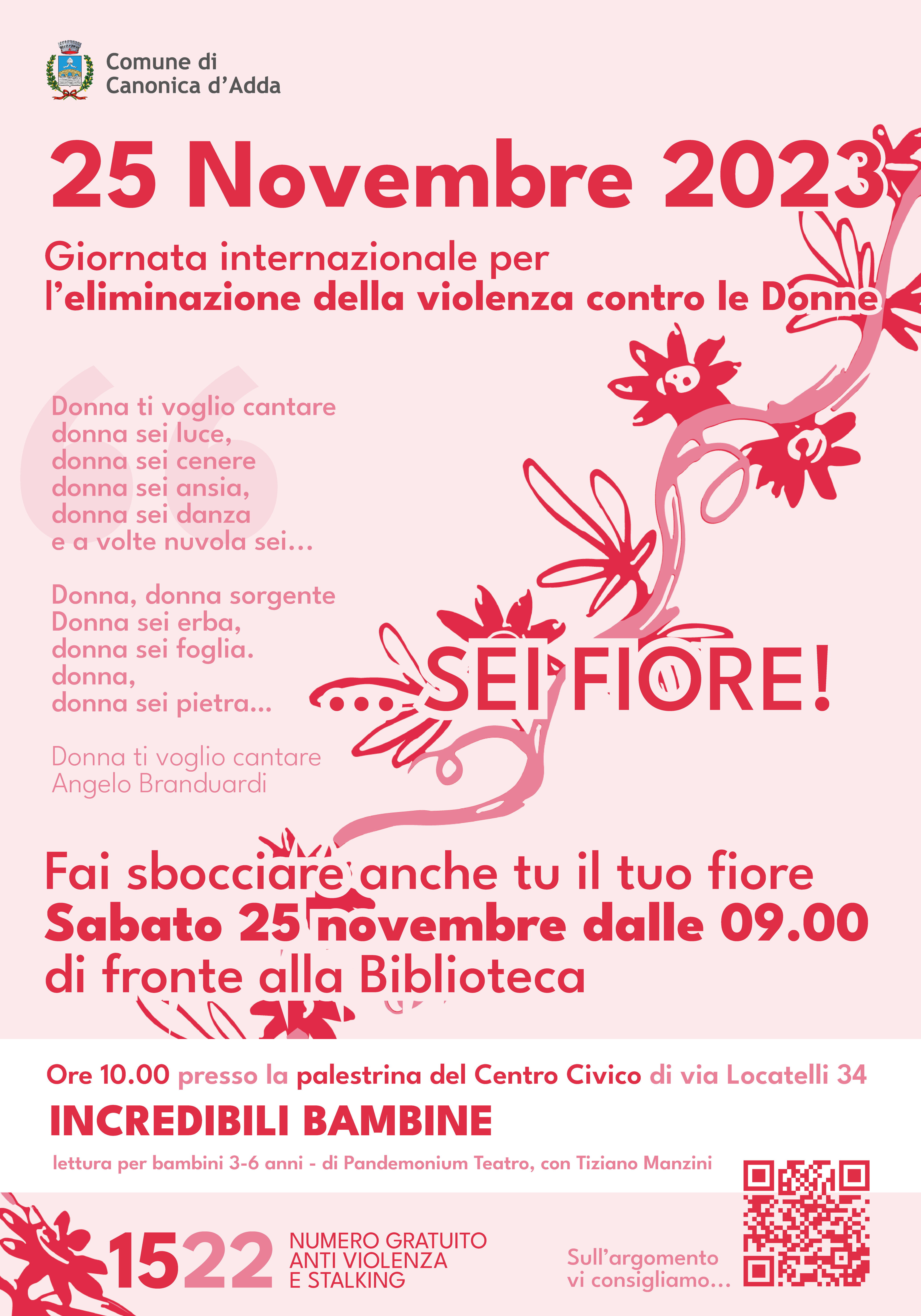 - Ti aspettiamo di fronte alla Biblioteca per fare fiorire la speranza: incolla il tuo fiore sul pannello, scegli una poesia, lascia un segno di partecipazione. Tutti insieme contro la violenza sulle donne