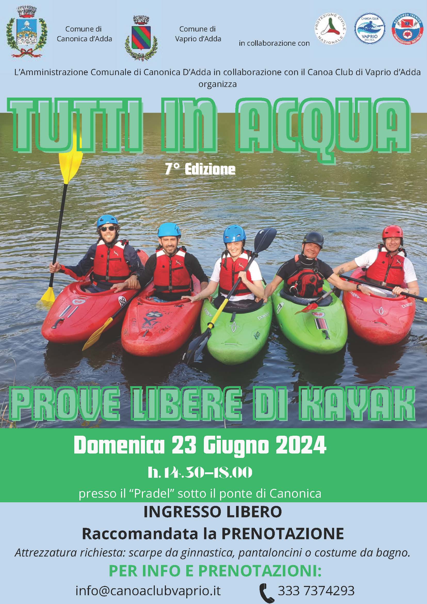 L’Amministrazione Comunale di Canonica, in collaborazione con il Canoa Club di Vaprio d’Adda, organizza la 7^ edizione di Tutti in acqua!, giornata di sport sulle rive dell’Adda