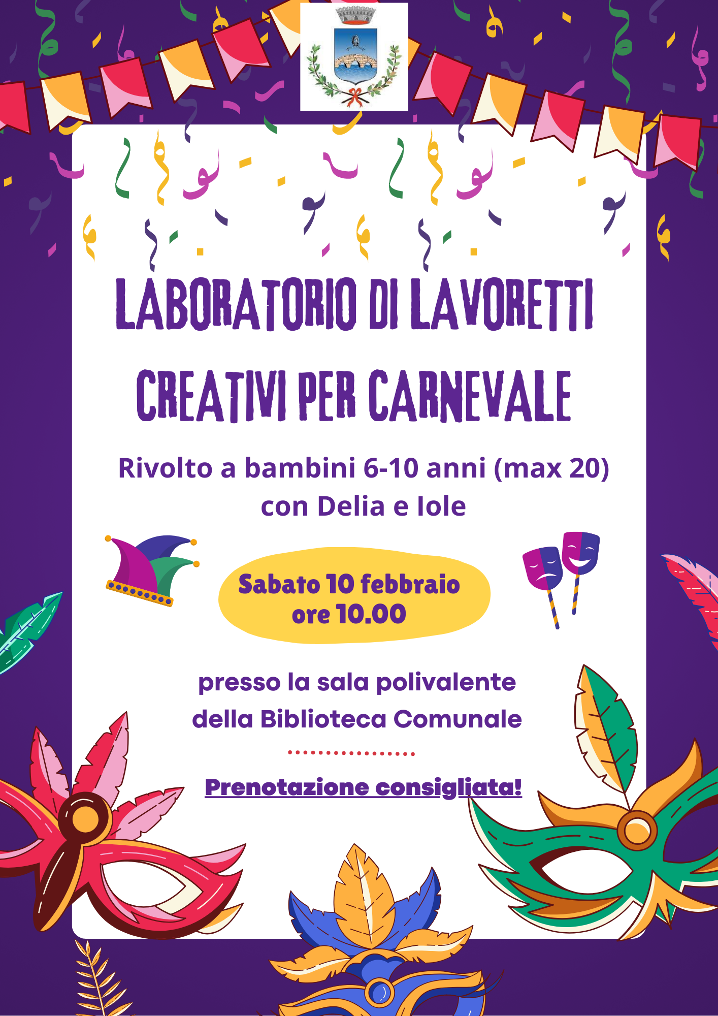 - Laboratorio di lavoretti creativi per Carnevale rivolto a bambini 6-10 anni, sabato 9 febbraio ore 10.00 presso la Biblioteca Comunale