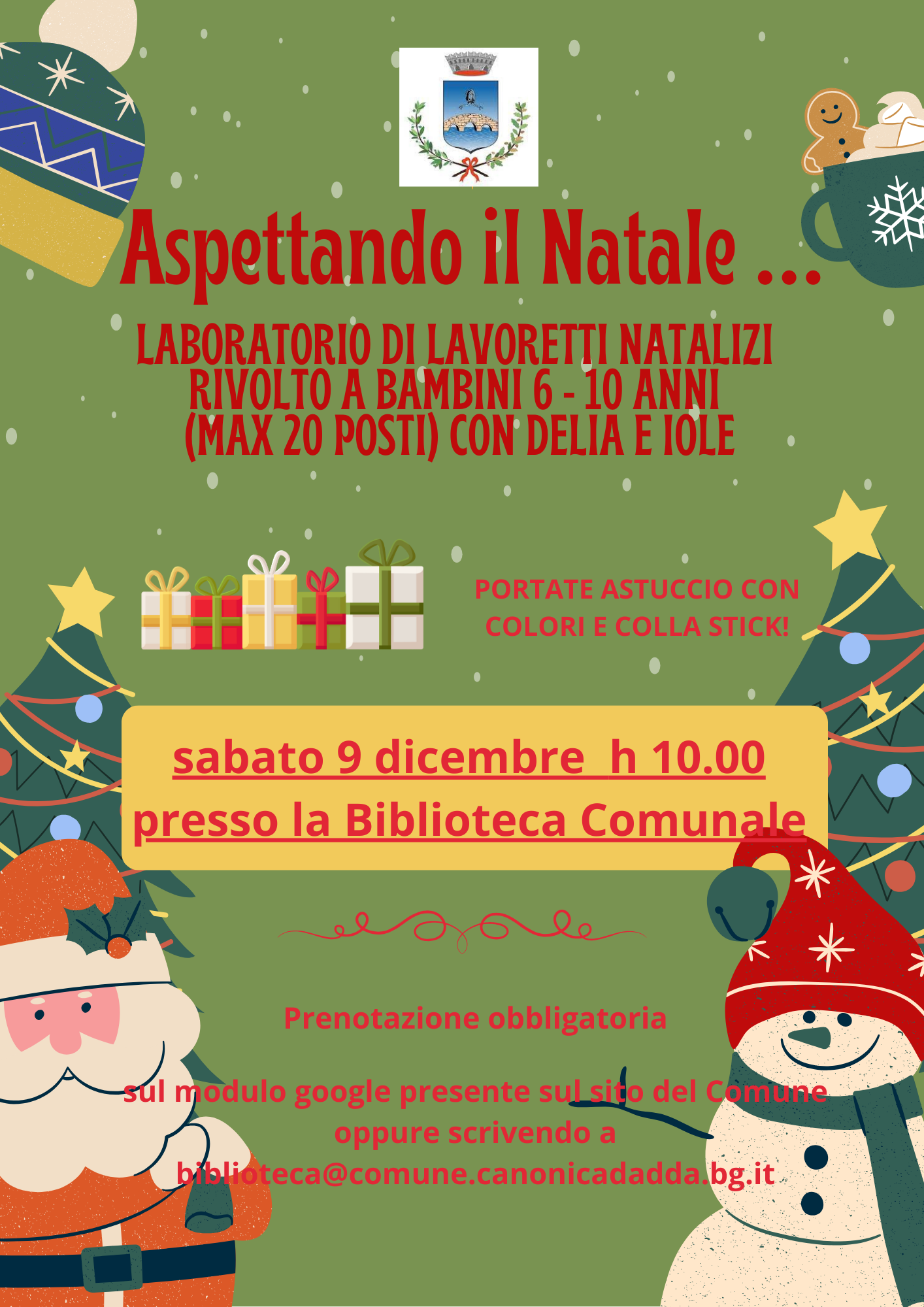 - Laboratorio di lavoretti natalizi rivolto a bambini 6-10 anni, sabato 9 dicembre ore 10.00 presso la Biblioteca Comunale