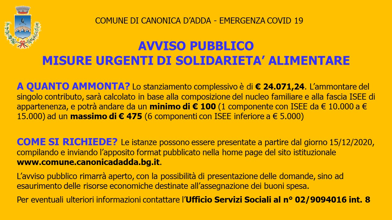 - In esecuzione del Decreto Legge del 23 novembre 2020, n. 154 “Misure finanziarie urgenti connesse all’emergenza epidemiologica da COVID-19” e all’Ordinanza del Capo del Dipartimento della Protezione Civile (ODPDC) N. 658 del 29 marzo 2020, ai cui allegati il Decreto rinvia, nonché in esecuzione della Delibera di Giunta comunale n. 95 del 05/12/2020, è indetto il presente avviso pubblico.