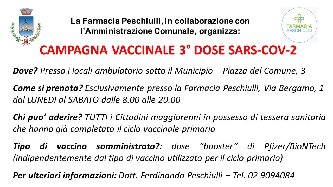 - La Farmacia Peschiulli, in collaborazione con l’Amministrazione Comunale, organizza CAMPAGNA VACCINALE 3° DOSE SARS-COV-2 Presso i locali del Comune di Canonica d'Adda