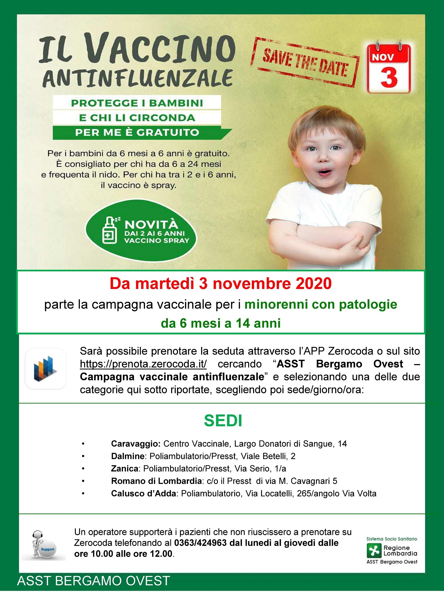 Quest’anno per effettuare le vaccinazioni nel rispetto delle norme di sicurezza anti COVID, l’accesso alle strutture vaccinali avverrà esclusivamente su appuntamento attraverso la prenotazione sull’APP Zerocoda o al sito https://prenota.zerocoda.it/ cercando “Vaccinazioni ASST Bergamo Ovest” e selezionando la sede più prossima alla propria residenza (residenza che deve essere in uno dei 76 paesi dell’ASST Bergamo Ovest).