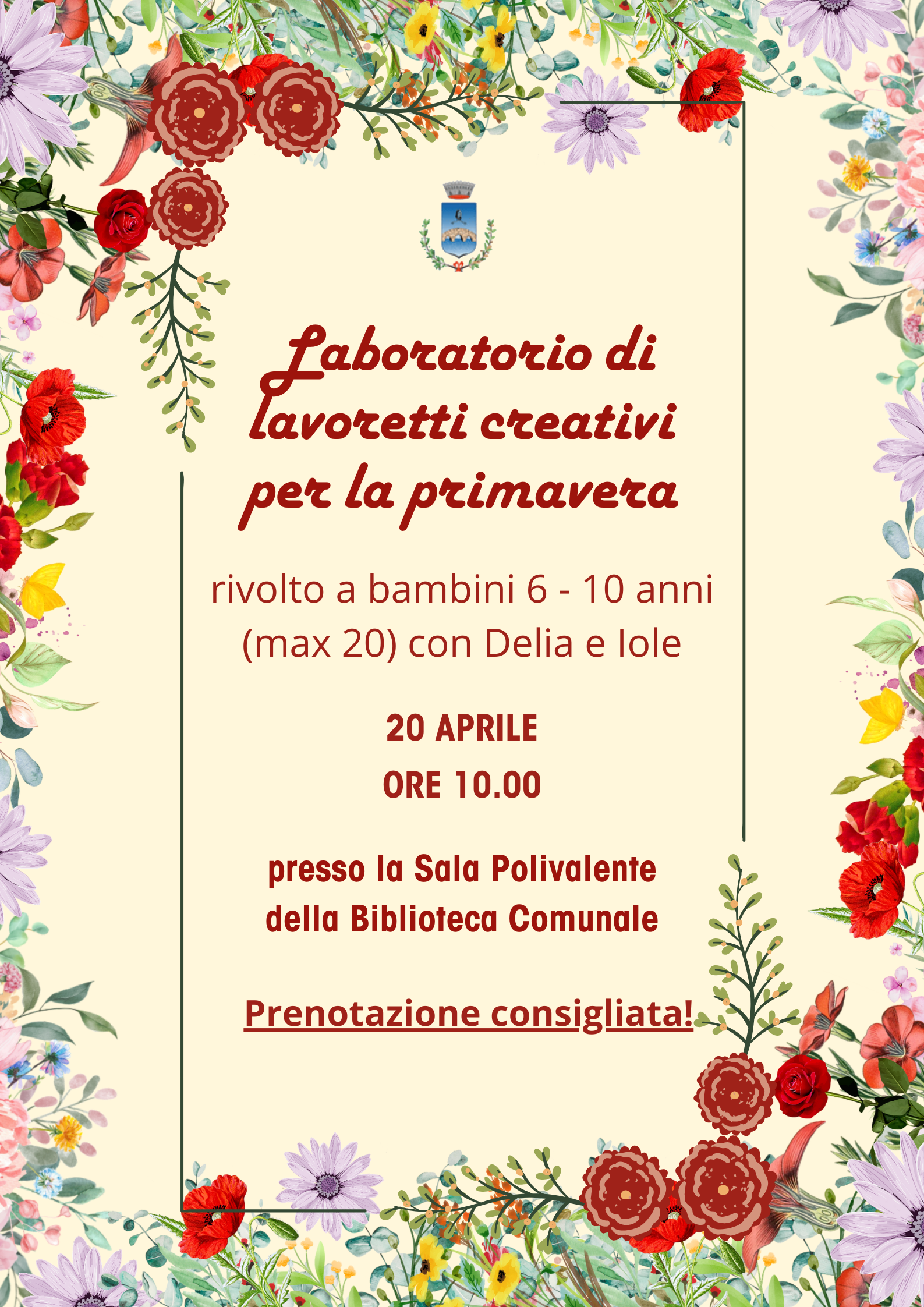 - Laboratorio di lavoretti creativi per l’arrivo della primavera rivolto a bambini 6-10 anni, sabato 20 aprile ore 10.00 presso la Biblioteca Comunale