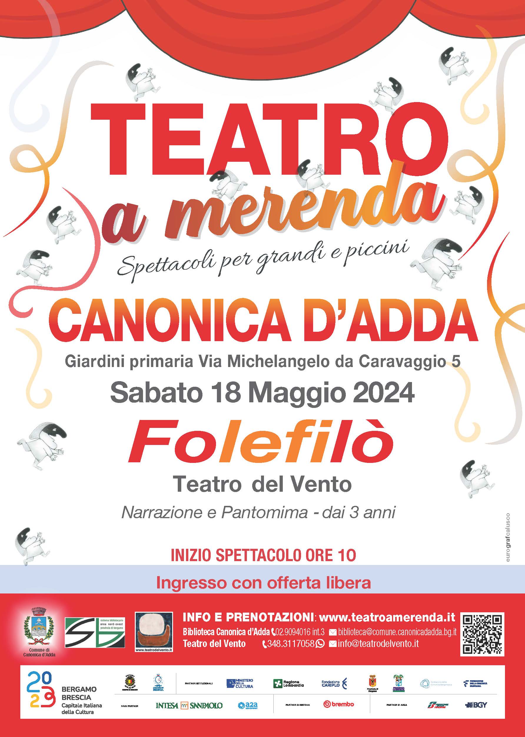 Siete tutti invitati sabato 18 maggio 2024 ore 10 a Canonica d’Adda, presso la Sala Polifunzionale Via Locatelli 34 per Folefilò, spettacolo di affabulazione e pantomima a cura di Teatro Del Vento, per la regia di Lando Francini, di e con Chiara Magri. Dai 5 anni in su, il divertimento è assicurato!