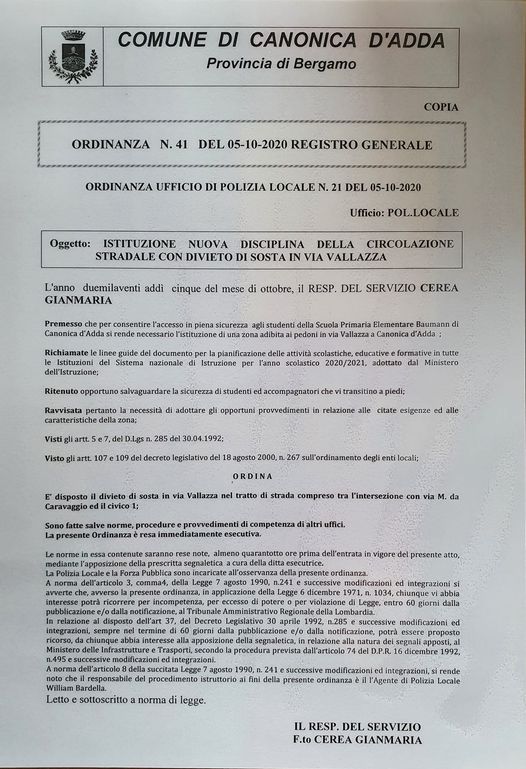 • ORDINANZA UFFICIO DI POLIZIA LOCALE N. 21 DEL 05/10/2020