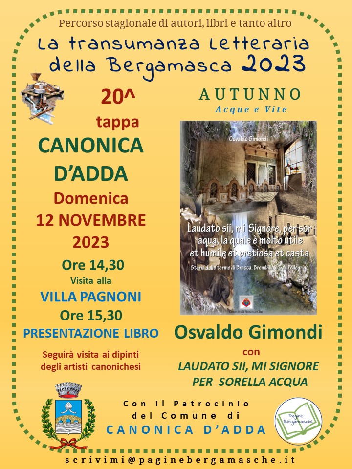 Alle ore 15.30 nell’appartamento di proprietà comunale Osvaldo Gimondi presenterà il suo libro Laudato sii, mi Signore, per sor aqua, la quale è molto utile et humile et pretiosa et casta : storia delle terme di Bracca, Brembilla e San Pellegrino