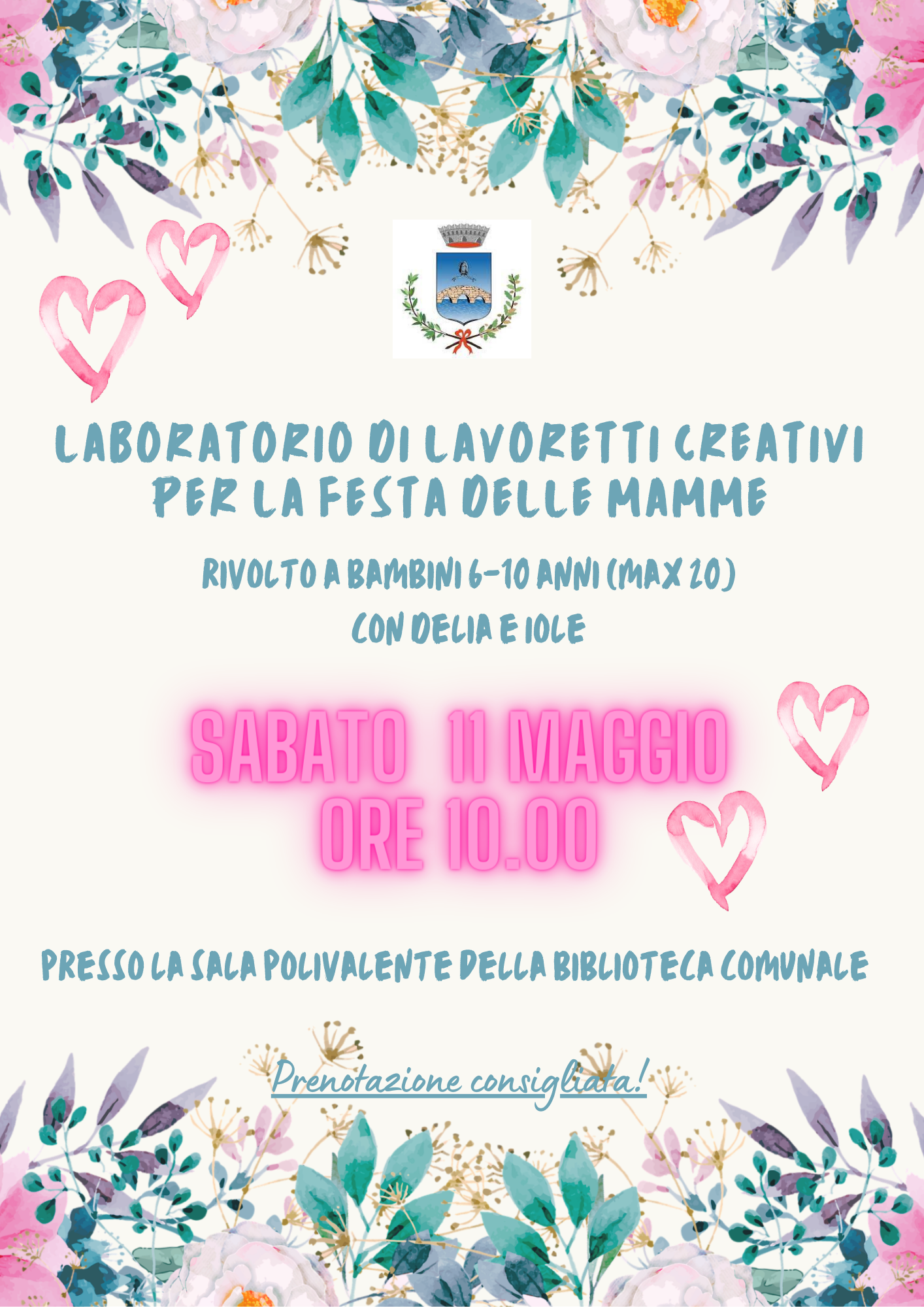 - Laboratorio di lavoretti creativi per la Festa delle Mamme rivolto a bambini 6-10 anni, sabato 11 maggio ore 10.00 presso la Biblioteca Comunale